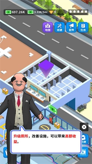 3、玩家还需对厕所进行升级以完善设施,助力自己获取更高收益;