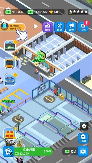 《疯狂客运城》是一款写实风格的客运城模拟经营游戏,整体采用Q萌卡通画风。游戏玩法以轻松的放置模式为主,玩家可通过解锁各类经营设备逐步扩大客运城规模、提升收益,同时招募更多能力出众的员工。此外,挂机系统能让玩家解放双手,只需等待客运城自动运转并收取盈利即可。需要注意的是,游戏内部分设施会产出金钱,点击对应的金钱图标就能获取,这些金钱可用于升级施工设备。感兴趣的玩家不妨来体验一番!