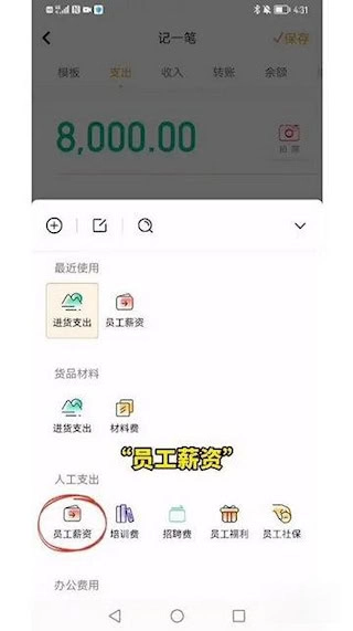 3、神象云支持“二级分类”,先选定大的一级分类,再挑选小的二级分类。比如记录给员工的薪资,可分类为:人工支出-员工薪资。