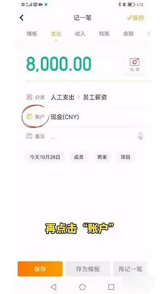 5、此外,还能修改时间,以及增添备注、商家、成员、项目等信息。填写结束,点击“保存”,便完成一笔记账。