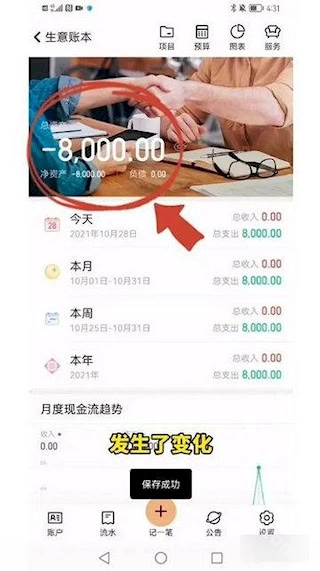 6、软件自动返回账本首页,顶部数字会发生变化。若不放心,可点击页面“今天”,进入流水页面,就能看到一条对应流水。