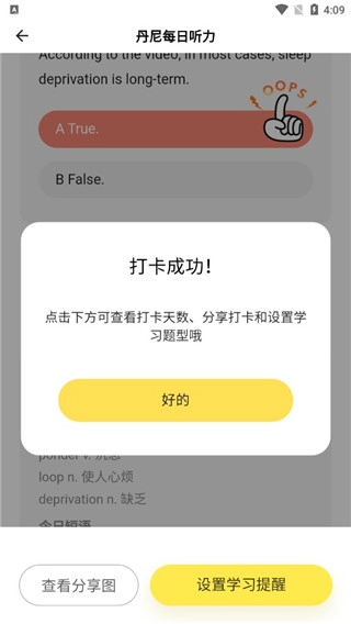 7、打卡之后,你可以查看打卡天数、分享打卡和设置学习题型