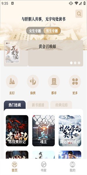 1、打开,进入首页可以看见男女分频模式,这里有热门连载、新书速递、经典完结等资源