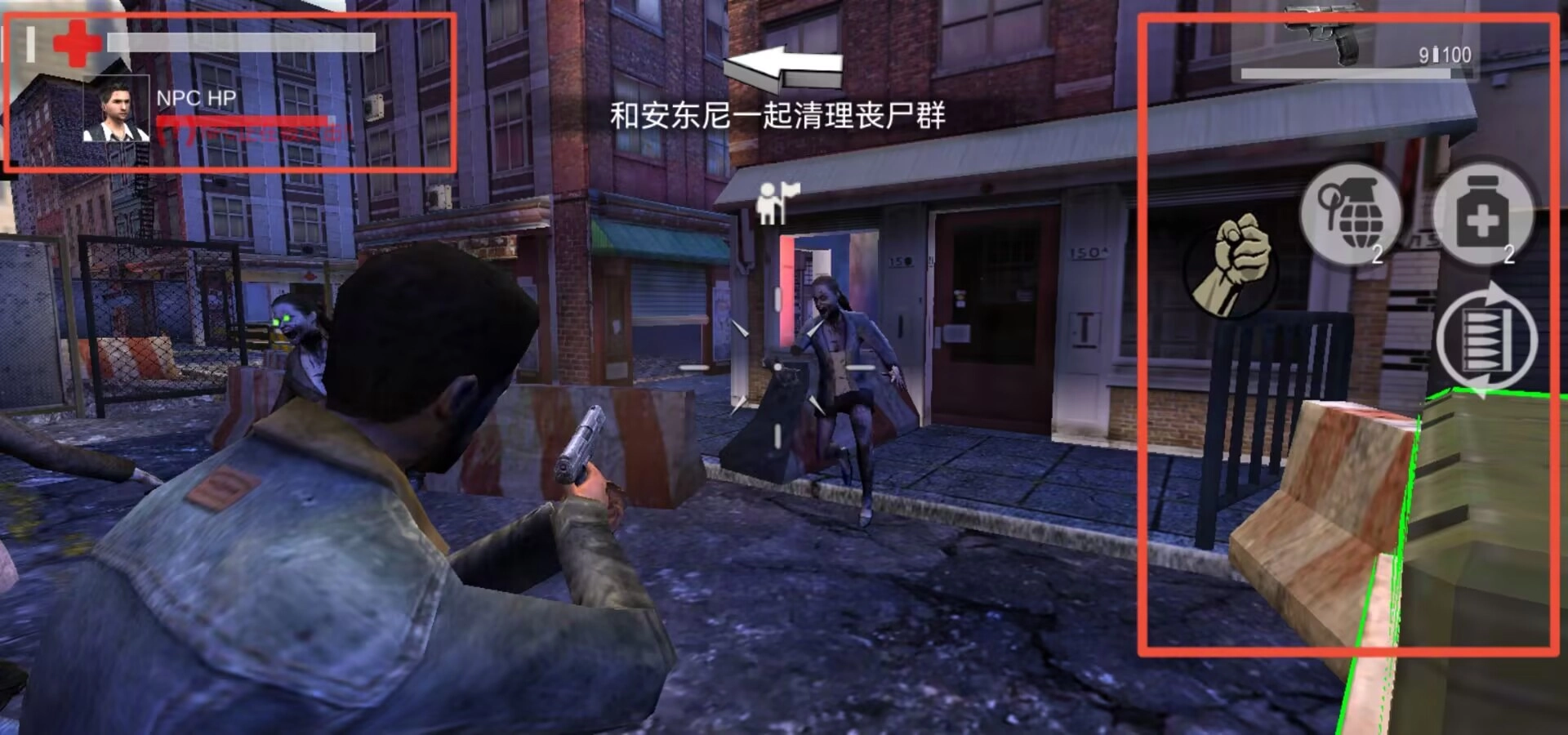 2、选定关卡进入战斗后,界面左上角会呈现NPC的生命状态,顶部配有任务指引信息,右侧则排列着攻击、投掷、治疗以及换弹的功能按键。