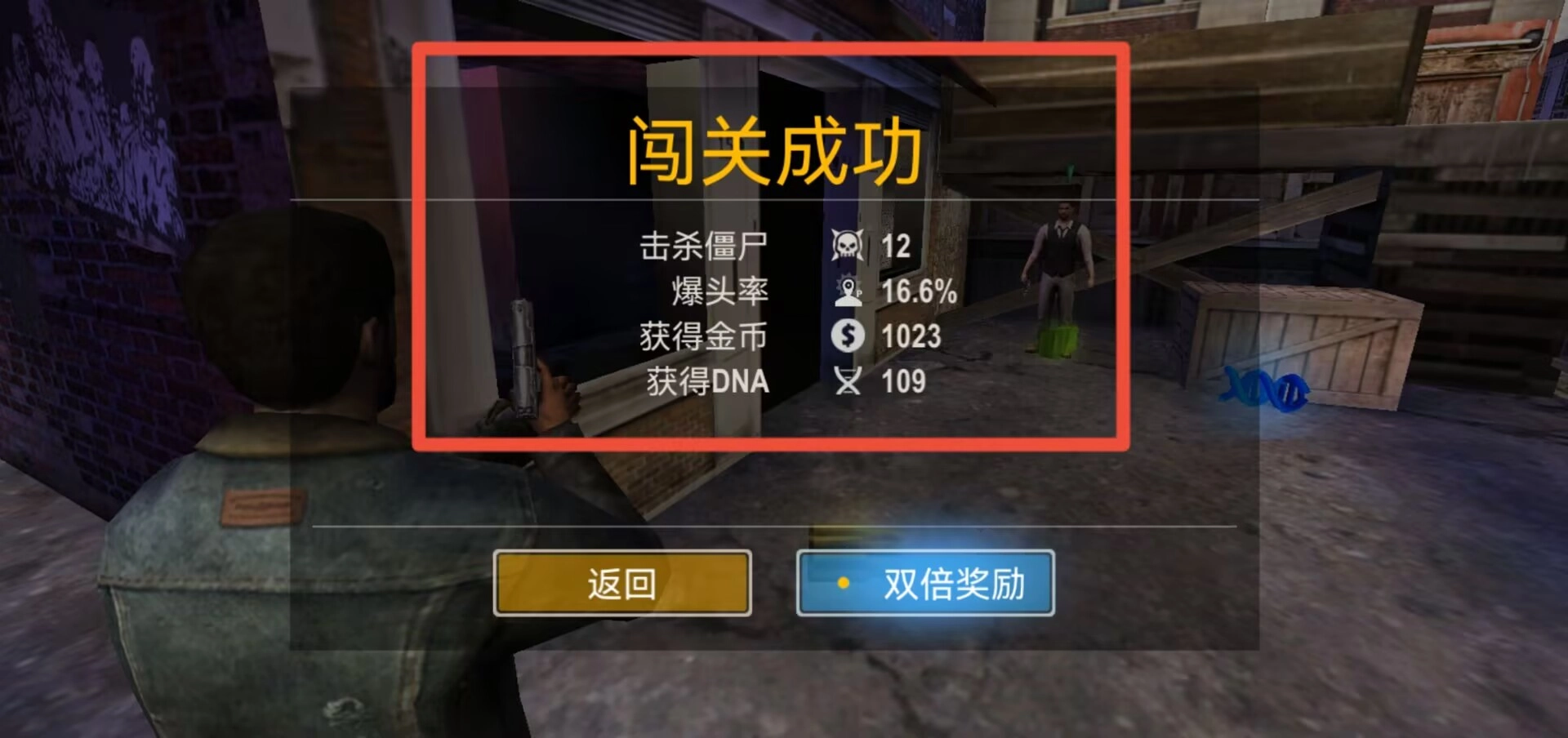 3、通过右侧屏幕滑动控制准星锁定目标自动开火,战斗结束后统计界面展示击杀数据与奖励详情,点击返回按钮退出结算页面。