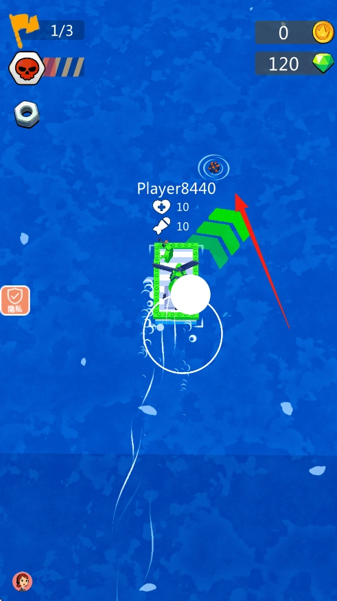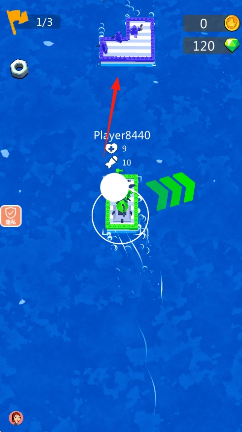 1、玩家标识为Player8440,包含血量爱心、弹药(炸弹数值)、金币与钻石资源,此外还有隐私按钮以及进度标识1/3。