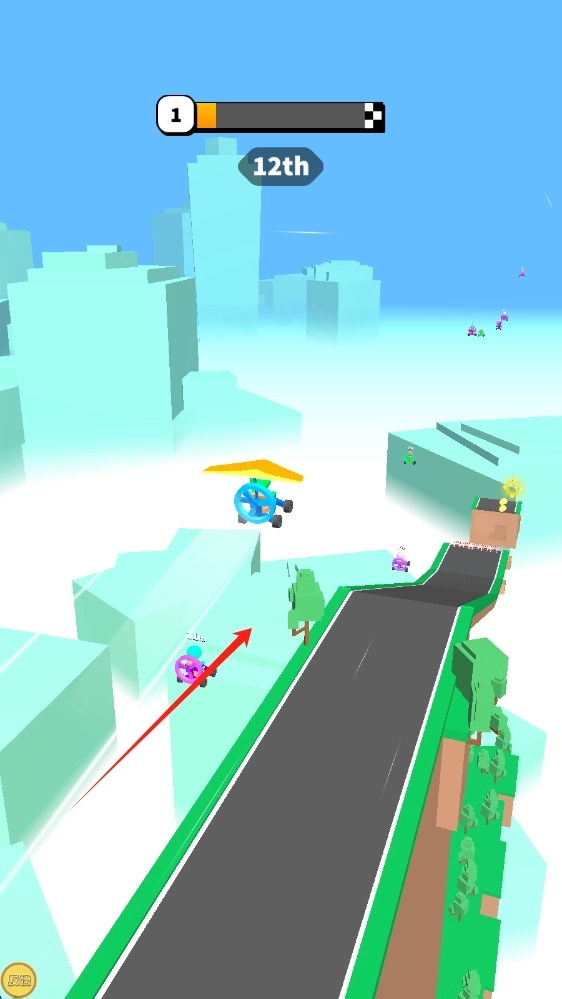 2、进入竞速场景,跟随箭头提示,操控角色,躲避障碍,超越对手,争取领先,点击滑翔。