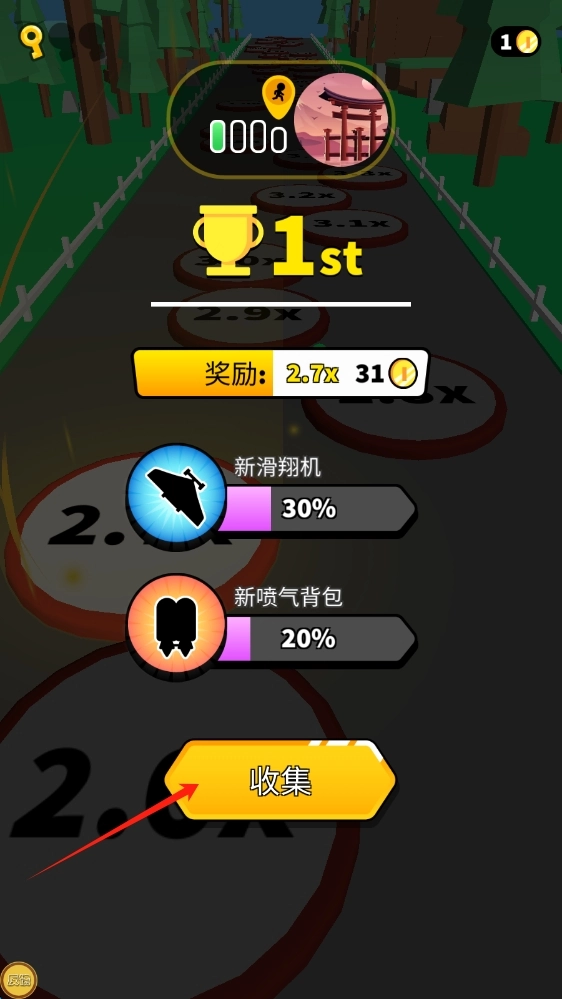 3、在关卡成功界面,点击“收集”按钮即可获取奖励,这些奖励能帮助提升角色能力,从而为后续的竞速任务做好准备,所以记得点击“收集”。