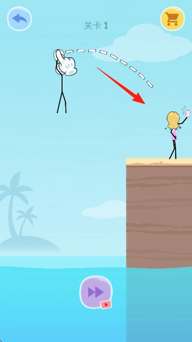 1、进入游戏后,在关卡1的界面中,角色正悬挂于海上,此时需按照箭头指示的方向划出支点,以便角色能够滑行。
