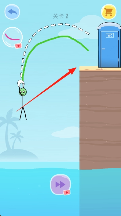 2、进入关卡2的界面后,角色处于悬崖下方,需按照红色指示箭头前往wc所在位置。