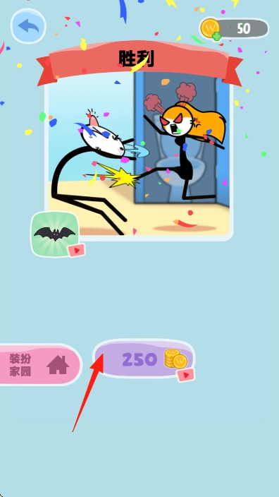3、顺利通关后,会弹出结算页面,上面会显示获胜获得的金币,还有一个可以用来装扮家园的按钮。