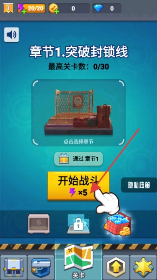 1、进入游戏界面后,按照红色箭头指示的方向,点击开始战斗按钮,即可开启游戏的冒险挑战并进入游戏主场景。