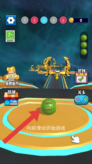 1、设有向前滑动以开始游戏的提示,呈现出太空或科幻风格的赛道场景,这是游戏开始前的准备页面,用于引导玩家开启滚球跑酷玩法。