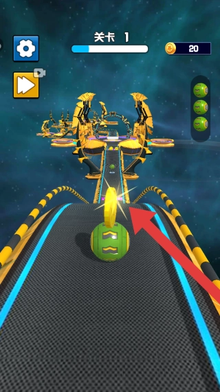 3、玩家操控绿色滚球在充满科幻感的赛道上前进,当遇到前方有障碍物阻挡时,能够借助滚球的速度进行撞击,这是滚球跑酷类型的闯关环节。