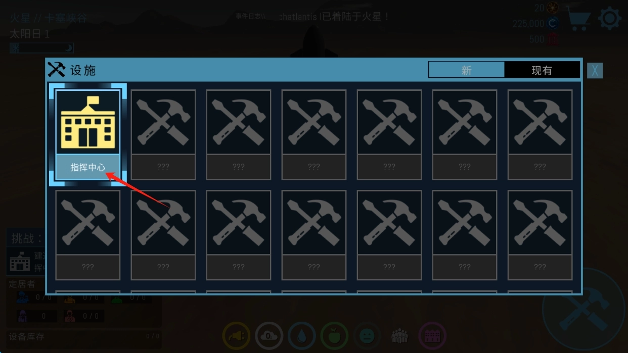 2、进入设施建造界面,选择指挥中心等关键设施,合理规划火星基地布局,为后续建设奠定基础。