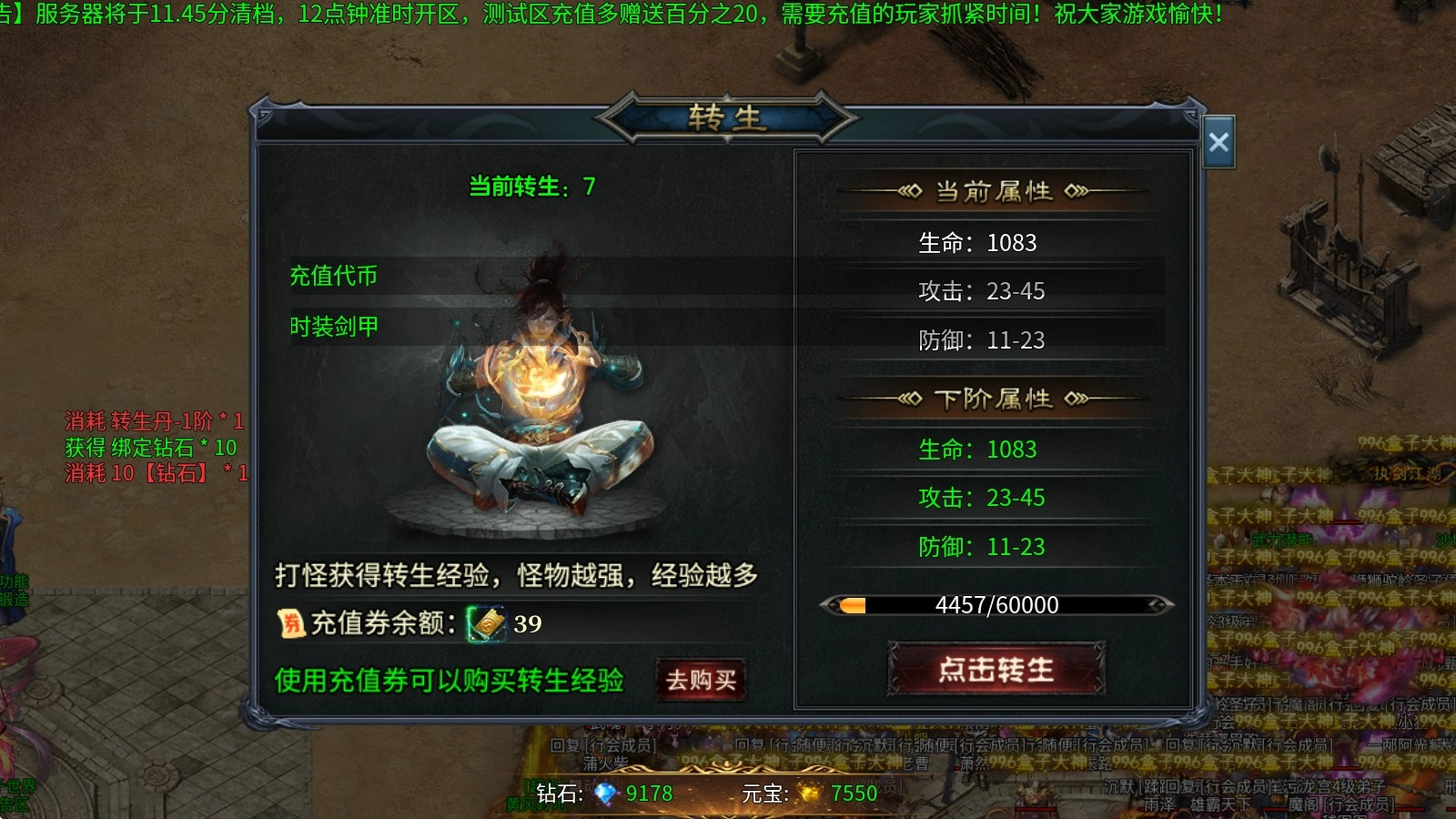1、转生使者:通过打怪即可获得转生经验,怪物越强转生经验越多,消耗转生经验即可升级提供生命、攻击和防御加成。