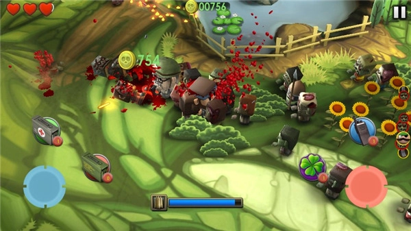 3、游戏画面依旧沿用了人气颇高的2.5D构图,还加入了动画渲染效果。主角与怪物均为方块造型,十分Q萌,尽管是击杀僵尸的设定,却毫无血腥感,反而充满了喜感。游戏的场景刻画也相当精致细腻。