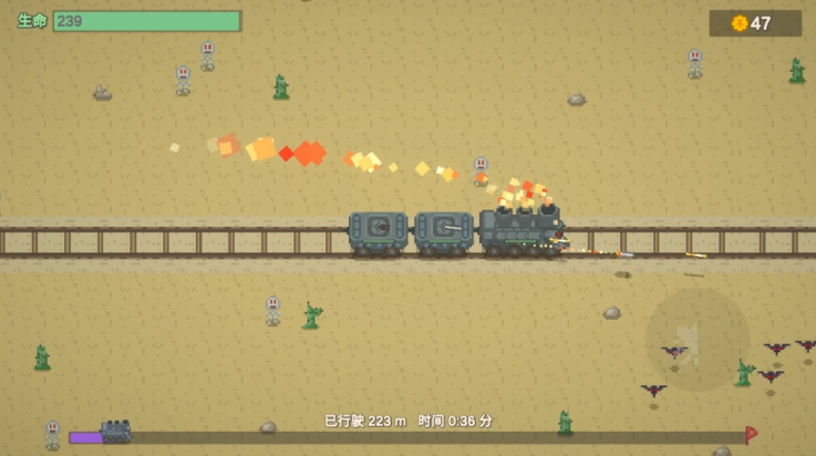 驾驶着列车在黄沙覆盖的废墟间穿行,沿途消灭那些畸变的怪物,收集各类资源来升级列车、解锁不同功能的车厢。白昼的时长逐渐缩短,黑夜即将降临,最终会迎来无尽的永夜,而更恐怖的威胁正潜伏在永夜之中。每一次的旅程都是随机生成的,你需要在绝境里为了生存而奋力战斗。