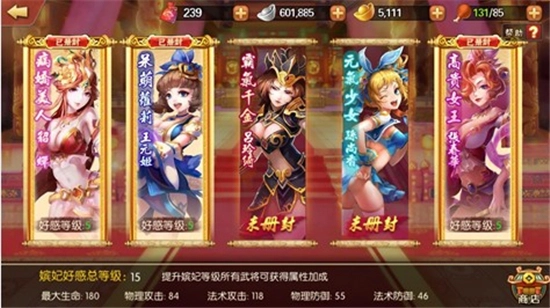 后宫玩法:妃子是五位,达到册封条件就可以解锁了,这个不仅仅是啪啪玩的,提升战斗力才是最重要的,其中馈赠可以提升妃子的好感,每提升一级就会增加所有武将生命,攻击,防御属性(馈赠材料副本可以获得,元宝也可以购买材料来赠送) 临幸可以生宝宝,喂养可获得香囊,购买童男童女武将及神兵