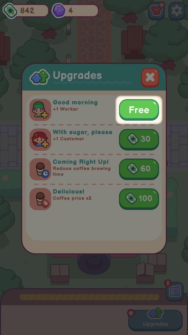 4、当你忙不过来时可以点击右下角的[Upgrades]进行员工招募。