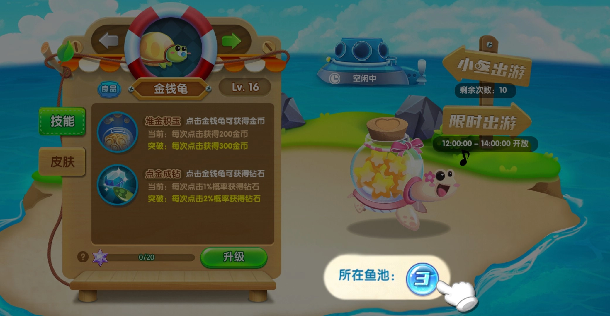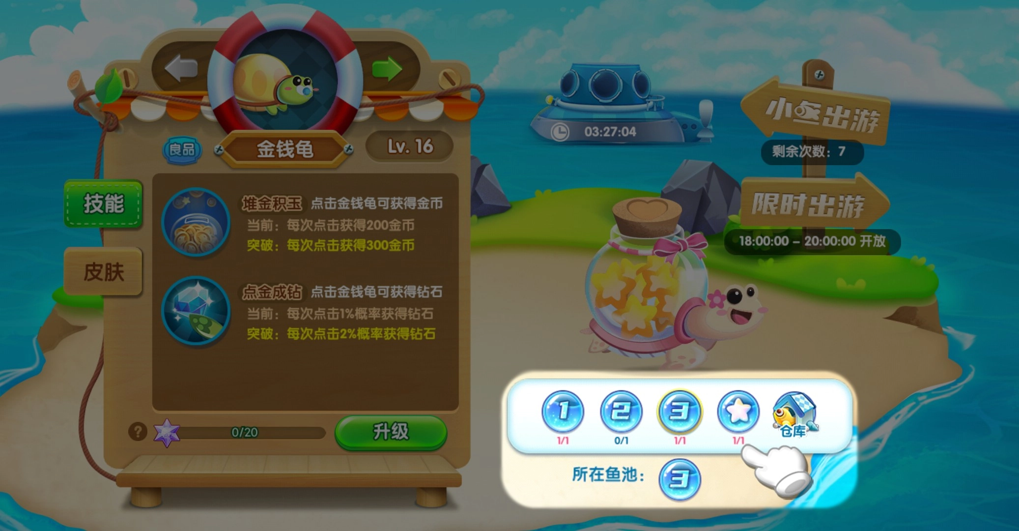 宠物还能出游,分为两种,普通出游跟限时出游,两边都能获得对应的鱼,宠物升级所需的材料也是出游获得哦~