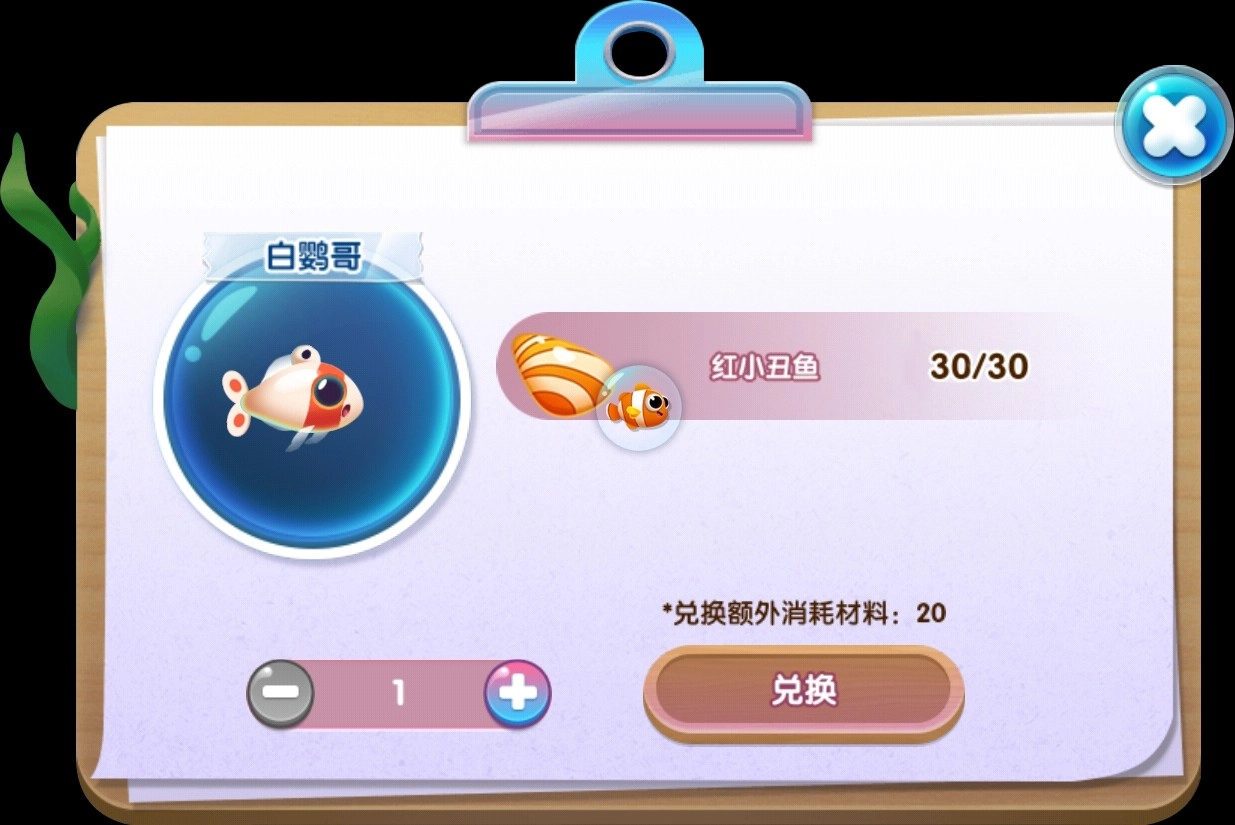 在每条小鱼的下方箭头左侧是需要的鱼宝,中间是已有数量和兑换需要的数量,右上角则是这条小鱼会产出的鱼宝~
