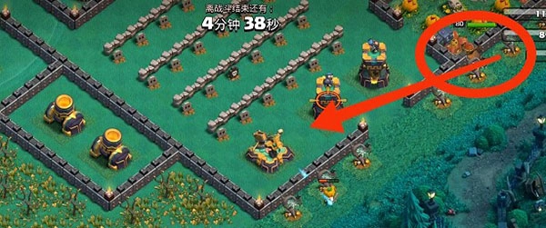 1、右侧红圈区域内有2个女武神,女武神会自动破坏墙体,破墙之后会前往攻击圣水罐。