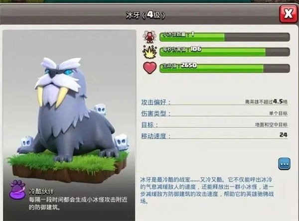技能--每隔一段时间升成小冰怪攻击防御建筑,偏好离不超过英雄4.5格。