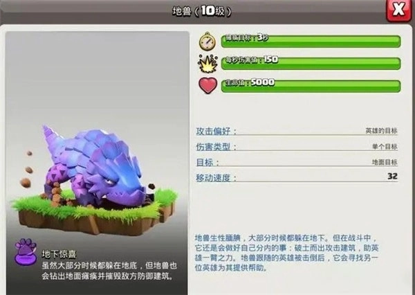 技能——潜藏于土中,破土而出时能瘫痪敌方防御建筑并发起攻击,并且该英雄阵亡后可与其他英雄协同作战。