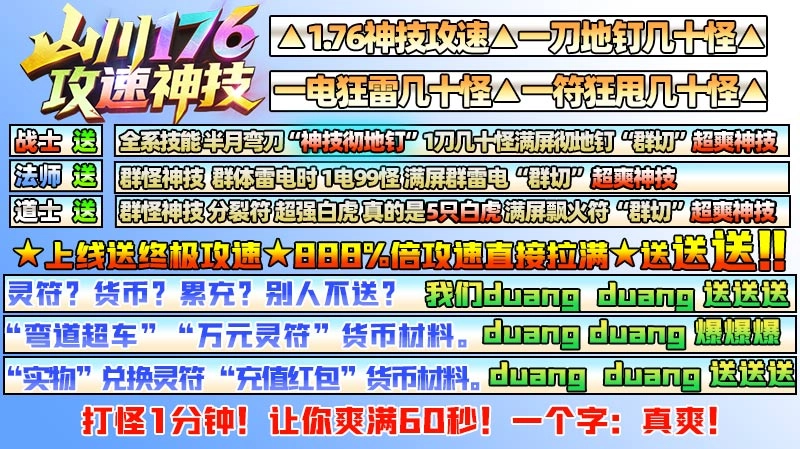 山川176攻速神技是一款畅快的复古传奇游戏。玩家可以轻松挂机冒险,装备自动回收,无需费心就能尽情驰骋在热血传奇世界。超高的爆率让散人打金更具乐趣,游戏支持武器自由交易,轻松就能获取海量元宝。各类挑战活动会不定期开启,为玩家提供丰富的挑战机会,助力大家在战斗中提升实力,在冒险中不断成长变强。