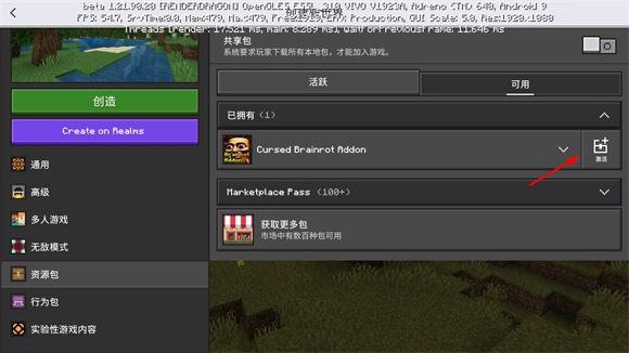 2、在右边可用一栏点击图标然后分别激活资源包与行为包。