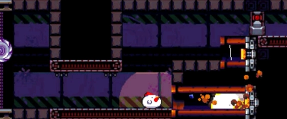 来到这里鸡站在二楼往前走,放一个炸弹让传送带把它送下去,炸掉下面的石墙。