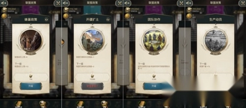 包含四种发展方向:成员上限,成员互助,资源增产,战争增益。有联盟等级要求才能解锁,政策可以重置为0。