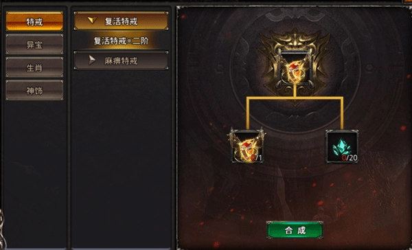 说明:合成系统可从游戏右下方“合成”入口进入。合成系统初始只有四部分,分别是特戒、异宝、生肖、神饰。