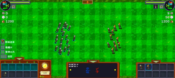 3、游戏开始后,随着顶部倒计时的结束,系统将自动为敌我双方分配资源(人数,资金),你可以根据我方当前的资源选择适合的僵尸出动,你也可以通过暂停或恢复我方僵尸的出动,每出动一位僵尸都将从当前资金(有硬币标记的那一栏)扣除当前僵尸所需的钱,当前资金不足或僵尸人头数为0时将无法出动僵尸,资源根据不同关卡而定都有上限。