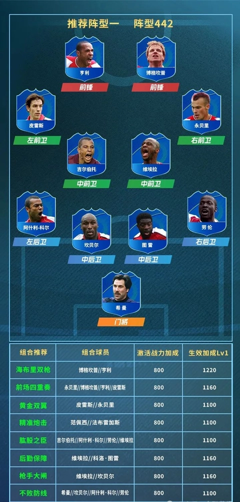 攻守平衡的442阵型能让每位球员的特点都得到最大程度发挥。球员组合上,不仅有当年在英超声名赫赫的前锋搭档“海布里双枪”博格坎普与亨利,还有“黄金双翼”皮雷斯和永贝里,他们四人组成的“前场四重奏”足以让任何对手心生畏惧;后防线上,“不败防线”希曼、坎贝尔、阿什利-科尔与劳伦坐镇,再加上维埃拉极具威慑力的防守覆盖能力以及图雷出色的回追能力,进一步形成了防守端的“后勤保障”组合,硬度与速度兼备,堪称海布里的守护神!