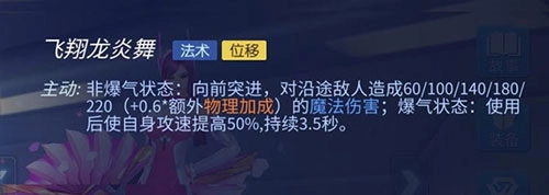 三技能是飞翔龙炎舞,是位移技能,爆气状态比非爆气多了使用之后提高自身攻速3.5秒