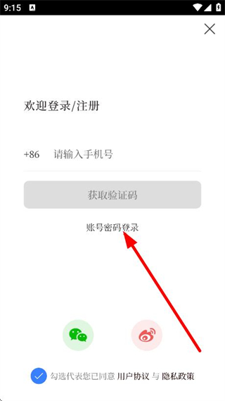 3、在登录注册页面,点击账号密码登录,切换到账号密码登录界面。