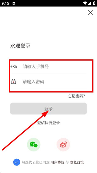 4、在账号密码登录界面,输入手机号和密码后,点击登录,完成登录操作。