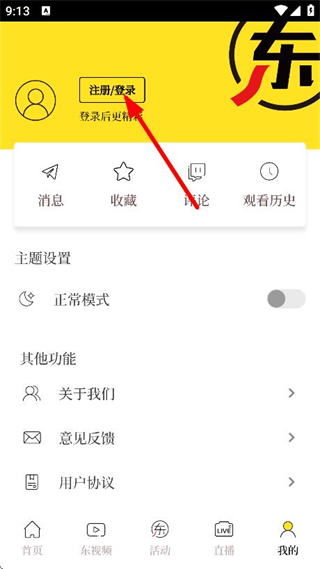 2、在个人页面,点击注册/登录,进入登录注册页面。