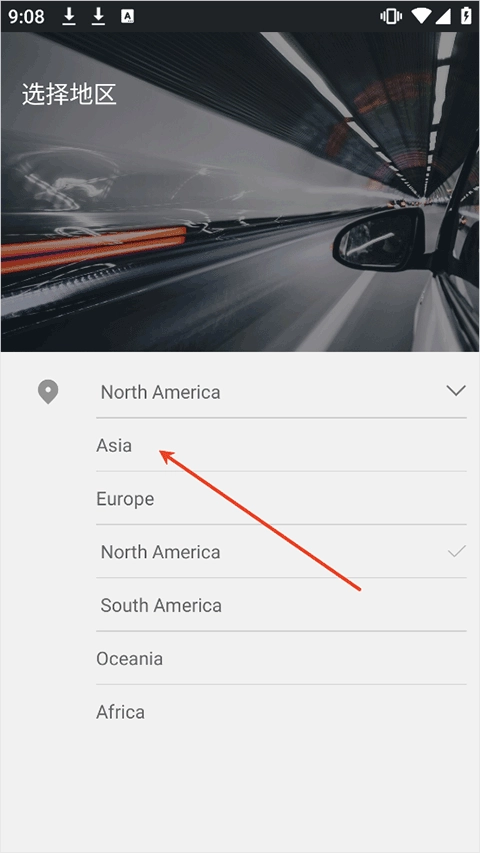 1、在手机上安装好软件后,即可打开进行软件界面,由于是国际版本,首先用户设置下地区,这里点击下图红色箭头所指处