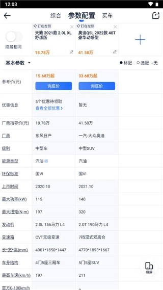 6、如此一来,在打开的页面上,系统便会呈现出两款车型的详细对比情况。