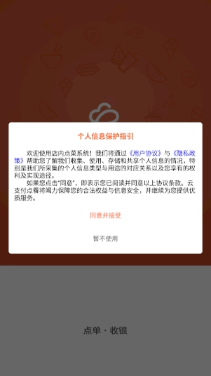 1、并安装打开店内点菜系统,阅读协议自行选择是否同意
