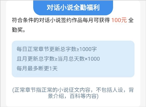 符合条件的对话小说签约作品每月可获得100元全勤奖。