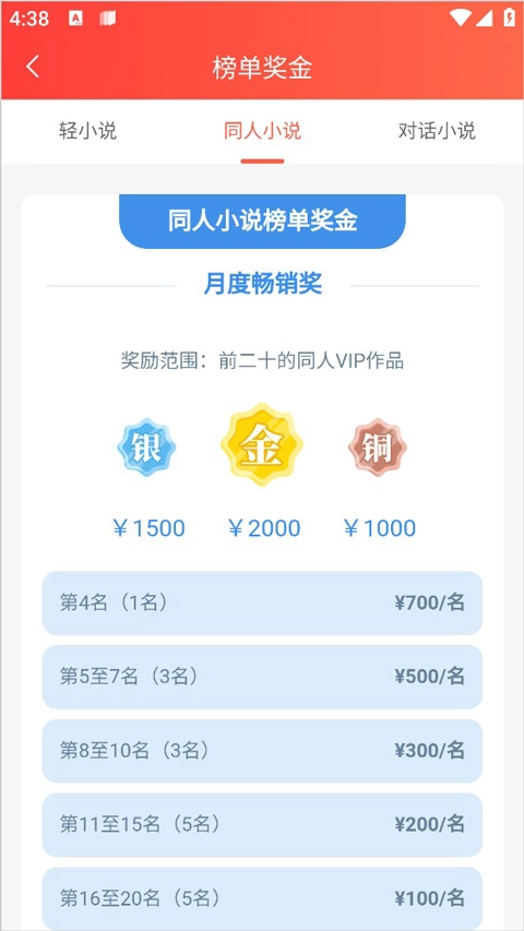 符合条件的同人小说签约作品每月可获得300元全勤奖。