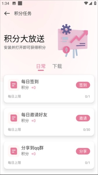 2、积分大放送中就能够通过完成各种任务去进行积分的领取,有日常任务也有任务。