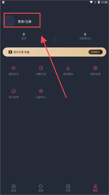 2、在设置界面,点击头像位置的“注册/登录”选项进入。