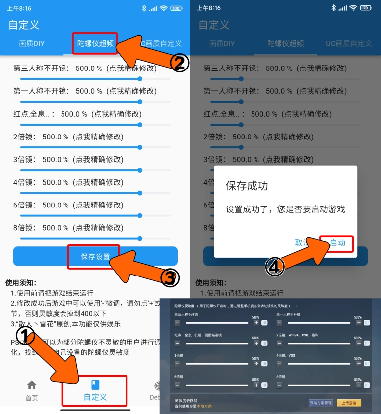 调节至适合自身的陀螺仪灵敏度,随后点击保存设置,待设置成功后,点击启动便可。