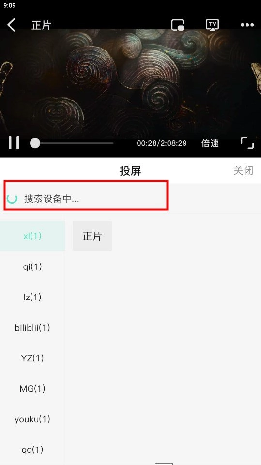 2、点击上方列表中的设备名称进行投屏,如果投屏失败尝试切换视频源。投屏后可关闭不影响电视观影。