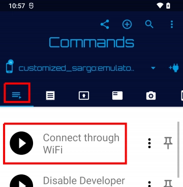 要使用 Bugjaeger 连接此方法,请先切换到“命令”选项卡。然后执行“通过WiFi连接”命令。它将允许在端口 5555 上进行连接。